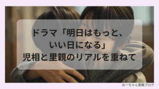 ドラマ「明日はもっと、いい日になる」 ドラマ「明日はもっと、いい日になる」児相と里親のリアルを重ねて 現在話題のドラマ「明日はもっと、いい日になる」を通して、ショートステイ里親の実体験と重ね合わせながら、子どもたちの居場所づくりについて考察します。児童相談所の現実、家族再生への希望、そして社会全体で子どもを支える意義について、里親の視点から丁寧にお伝えします。 2025.09.05 ドラマ「明日はもっと、いい日になる」