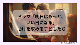 ドラマ「明日はもっと、いい日になる」 ドラマ「明日はもっと、いい日になる」子どもを預けるという選択肢 月曜9時に放送されていたドラマ「明日はもっと、いい日になる」をご存知ですか?児童相談所で働くことになった主人公が子どもたちを取り巻く様々な問題に真剣に立ち向かうヒューマンドラマです。第10話は児童虐待について。虐待された子どもとショートステイの役割について書きました。 2025.10.15 ドラマ「明日はもっと、いい日になる」
